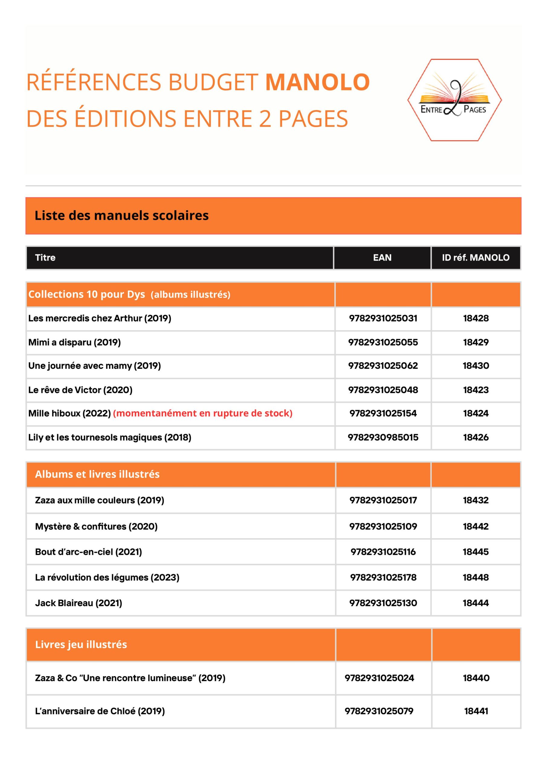 L ‘asbl « Entre 2 Pages » est une maison d’édition à compte d’éditeur. Son but est de promouvoir, de multiples façons, la lecture dès le plus jeune âge. Ses publications s’adressent aux jeunes enfants, aux adolescents et jeunes adultes. Une collection pour primo lecteurs et enfants dyslexiques, ainsi qu’un recueil d’informations pour aider à la mise en page de textes adaptés aux dyslexiques, complètent un catalogue composé de livres-jeux, d’albums illustrés, de contes et de romans. L ‘asbl « Entre 2 Pages » ne se limite pas seulement à la publication de livres, elle propose aussi des conférences et des animations en classe.